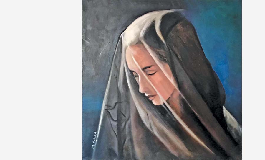إنجاز سيدة الرداء الشفاف المعنون «شفافية» كمحرار يعكس مستوى الهواجس النسوية في وضعية تتموقع بين الصمت والخضوع وهو عمل حديث من الحجم الكبير (80 x80) يعود لسنة 2023، شارك في المعرض الشخصي في دار الأوبرا المصرية. تمت صباغته اعتمادا على حضور موديل بشري ما يزيد في تقريب المعادلة الواقعية، غير أن التفاصيل المعتمدة حملت لنا عنصرين: