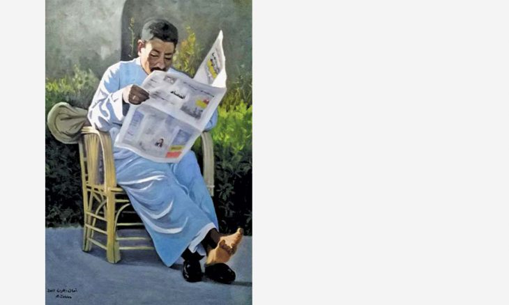 على عكس الخلفية المظلمة في عمل «شفافية» التي بدت فيها مساحة التأمل ضيقة وأفق العبارة محدودا، فإن «ساعة عصاري» انفتحت على محيط جنائني خلاب تتوسطه شخصية مهيمنة جالسة على كرسي، تبدو بصدد قراءة صحيفة تحتل بحضورها المهيمن مركز اللوحة. وهي معطيات لا يمكنها إلا أن تجذب القارئ والزائر لتفاصيل العمل المثيرة، لاسيما وأن الاشتغال على الدقة حاضر بقوة سواء كان ذلك في وسط اللوحة (ملامح الوجه، الصحيفة، الأريكة) أو في المساحات الجانبية (النبات، السيقان، الأفق البعيد) ناهيك عن التدرجات اللونية الملحوظة في المطفة من البارد إلى الحار (الأخضر/ الفستقي، الأزرق/ البرتقالي) ومن العتمة إلى النور (الرمادي/ الأبيض). هذا التصادم اللوني أحدث نقلة وحيوية في مكونات العمل، خاصة باستعمال تقنيات صباغية معروفة عالميا، تتناسب مع خامات الأكريليك والزيت، كالتراكب والتراكم الذي يظهر في تدرج الوجه من الفضي إلى البني وتنقيط الشجيرات ناهيك عن التجاور والترادف وعدد من العناصر اللونية الديناميكية، لاسيما على غلاف الصحيفة، مع التنويه بدرجة الإلمام بقاعدة «الجاف قبل الدهني» بحكم التعامل مع عديد الخامات. من هنا تطلب العمل قراءة عنصرين: