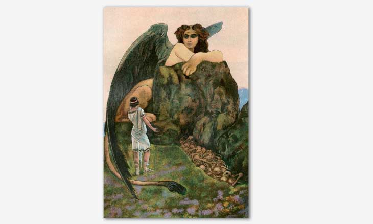 كان على أوديب أن يجيب بشكل صحيح على تلك المسألة («ما الذي يمشي على أربعة في الصباح، اثنتين عند الظهيرة، وثلاثة عند الليل؟»)، وإلا فإنه سيموت، وسيموت معه كل سكان مدينة طيبة. أجاب أوديب حينها جوابا صحيحا: («الإنسان: يمشي على أربعة في طفولته، وعلى قدمين حين يشبّ، وحين يشيخ يستخدم عصا ليتوكأ عليها»)، وقد اندهش أبو الهول من جواب أوديب الصحيح لدرجة أنه ألقى بنفسه إلى الموت، مطلقاً بذلك سراح أهل طيبة.