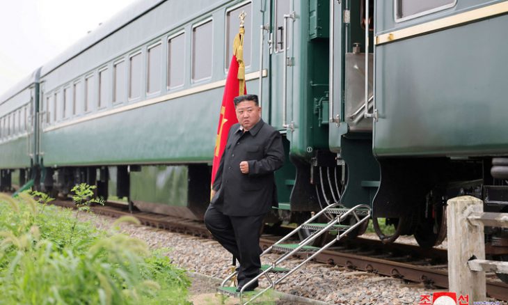 وعرضت صحيفة رودونغ سينمون صورا لكيم مع مساعديه وهو جالس على مكتب داخل القطار الأخضر الداكن، الذي بدا شبيها بالقطار المضاد للرصاص الذي استخدمه من قبل للسفر إلى دول أخرى.