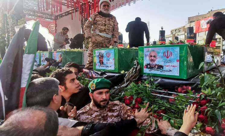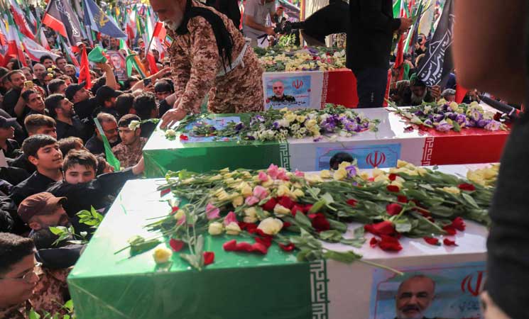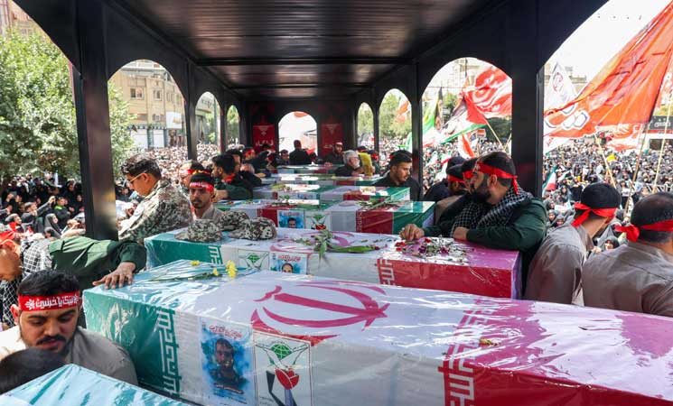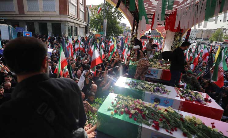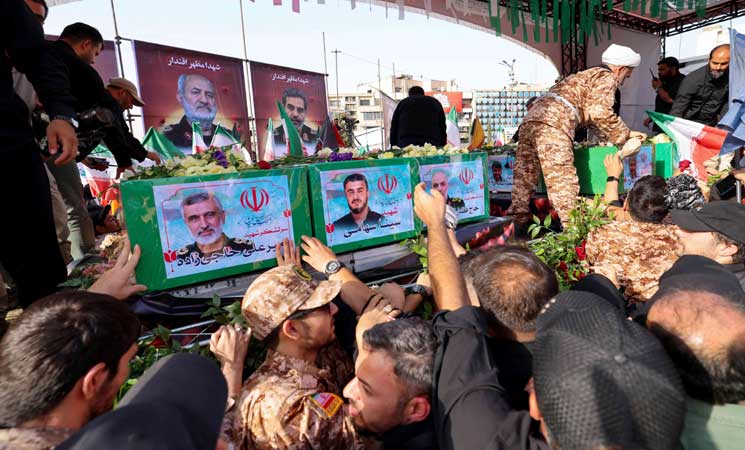 ونقل التلفزيون مواكب جنازة “شهداء الحرب التي فرضها الكيان الصهيوني”، وظهرت في المشاهد نعوش ملفوفة بالعلم الإيراني وعليها صور القادة القتلى باللباس العسكري.