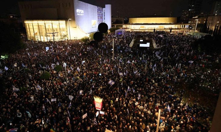 وشارك نحو 80 ألف إسرائيلي في قلب تل أبيب، ليلة السبت، رغم الطقس البارد، ورفعوا شعارات ضد الحكومة الفاسدة التي تعمل على تقليص صلاحيات كافة المؤسسات، عدا الحكومة، وتحويل إسرائيل لدولة استبداد. وتحتج أعداد كبيرة من الإسرائيليين من المعسكرات السياسية المختلفة على تغييرات تؤدي لتقزيم محكمة العدل العليا، وعلى سن “قانون الاستقواء” القاضي بترجيح كفة البرلمان والحكومة على المحكمة العليا وإلغاء ما يعرف بصلاحية المنطقية، أي منع القضاة من إصدار أحكامهم ضد مؤسسات الدولة بناء على قيامها بقياس المنطق والعقل السليم. كما يجري الاحتجاج على مساعي الحكومة لتغيير طريقة تعيين القضاة في المحاكم المختلفة، وإسباغ الشرعية على وزراء مدانين بتهم جنائية، أو متهمين بها.