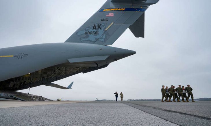 Members of the military carry a transfer case during a dignified transfer of the remains of U.S. Marine Corps Lance Corporal Kevin Melendez of Fort Worth in Texas, who died in Jeddah, Saudi Arabia in a nonhostile incident, at Dover Air Force Base in Dover, Delaware, U.S., March 4, 2026. REUTERS/Ken Cedeno