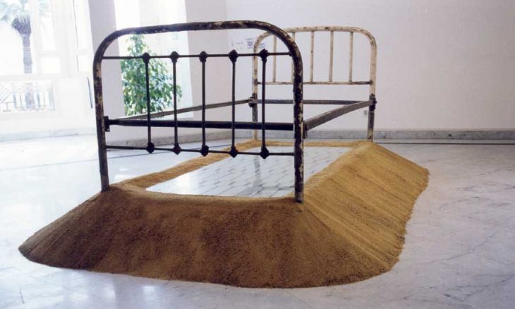 قدّم عباس سريراً للنوم من مادة الحديد، يرتكز على كثيب رملي جلب مادته من الأهرامات المصرية، السؤال هو ما العلاقة بين السرير والرمل؟ وما الدلالات الرمزية التي أراد أن يوحي بها الفنان في استخدام هذه المواد؟ وما علاقة هذه العناصر جميعاً بالوطن؟