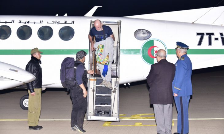 أعلنت وزارة الدفاع الجزائرية استلام المصالح الأمنية للجيش، الرعيةَ الإسباني المختطف منذ أيام في الصحراء الجزائرية والذي انتقل به خاطفوه إلى الأراضي المالية. وبثت صورا تظهر وصول “نافارو كانادا خواكيم” إلى القاعدة الجوية العسكرية بوفاريك شمال الجزائر.