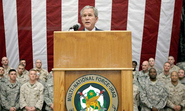 قال بوش إن النظام الديمقراطي في أمريكا نظام صالح رغم نقائصه لأنه يمنح المواطن، عبر الانتخابات الحرة، فرصة تغيير الأوضاع نحو الأحسن، لكن «بالعكس من ذلك فإن الانتخابات في روسيا مزورة، والمعارضين يسجنون أو يمنعون من خوض المسار الانتخابي. والنتيجة هي انعدام آليات الضبط والموازنة، وقرار رجل واحد شن حرب طاحنة ولا موجب لها إطلاقا على العراق…»! ثم سرعان ما استدرك بوش قائلا: «أقصد أوكرانيا».