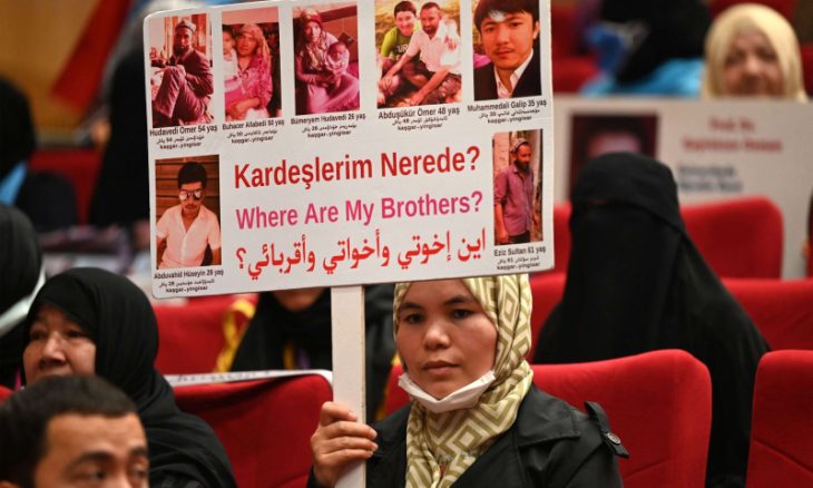 سيدة من الإيغور ترفع صور عدد من أقاربها المعتقلين في السجون الصينية