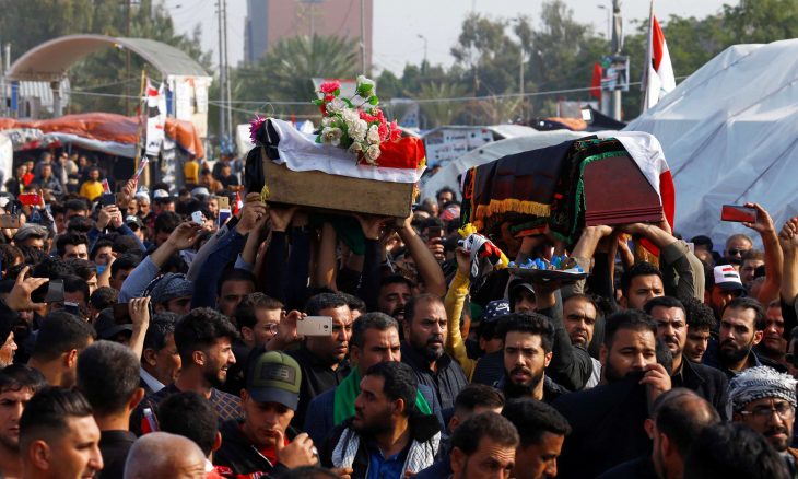 وقتل 70 متظاهرا خلال يومي الخميس والجمعة في مدينتي النجف (مركز محافظة تحمل الاسم نفسه)، والناصرية مركز محافظة ذي قار، برصاص قوات أمنية و”ميليشيات” مجهولة، وفق ما أبلغت مصادر طبية وشهود عيان.