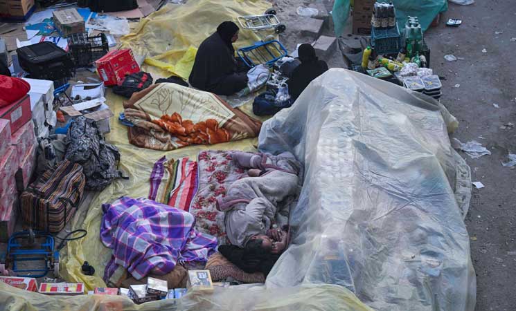 على رصيف غزاه الغبار، تنتشر بضائع في صناديق بلاستيكية أو أكياس رز، ويجلس باعة فيما ينام آخرون وقد تلحفوا ببطانيات أو قطع كرتون، قرب صناديق وحقائب سفر وأكياس بلاستيكية كبيرة لحمل البضائع.