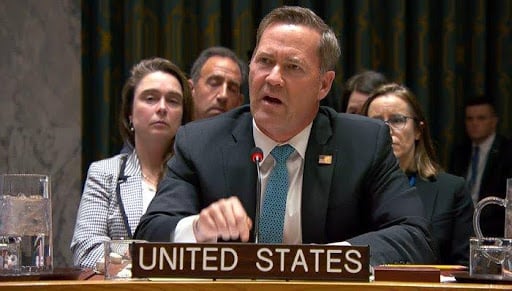 ورفض ما قال إنه ادعاءات من “النظام” في إيران بأن المظاهرات مؤامرة أجنبية لتكون ذريعة لعمل عسكري. وقال إن النظام يحكم عبر القمع والعنف والتخويف. وذكر أن الجميع يتحمّلون مسؤولية دعم الشعب الإيراني ووضع حدّ لقمع الأمّة الإيرانية. وأكد السفير الأمريكي أن الرئيس ترامب رجل أفعال، وأنه أوضح جليًا أن كل الخيارات مطروحة لوقف المذابح.
