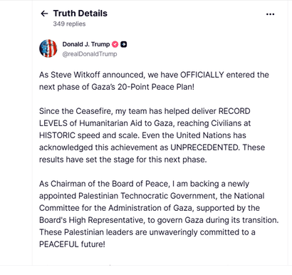 وأكد ترامب أنه “بصفته رئيس مجلس السلام” دعم هذه اللجنة الانتقالية من الخبراء التي ستكون مهمتها “حكم غزة خلال المرحلة الانتقالية”.