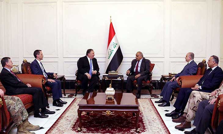 وقال بومبيو للصحافيين بعد اجتماعه مع رئيس الحكومة العراقية عادل عبد المهدي: «تحدثنا عن أهمية أن يضمن العراق قدرته ‏على حماية الأمريكيين في بلادهم بالشكل المناسب». كما قال بومبيو في مؤتمره الصحافي: «إن الهدف من الاجتماع هو إطلاع المسؤولين العراقيين على الخطر المتزايد الذي ‏رصدناه، حتى يتسنى لهم أن يوفروا الحماية بشكل فعال للقوات الأمريكية». وعبّر عن دعم بلاده ‏للسيادة العراقية قائلا «لا نريد تدخل أي طرف في بلادهم وحتما ليس عن طريق مهاجمة دولة أخرى ‏داخل العراق». كما اوضح مايك بومبيو أن الولايات المتحدة حثت الحكومة العراقية على التحرك بسرعة لإخضاع الفصائل المستقلة التي ‏تقع تحت النفوذ الإيراني لسيطرة الحكومة المركزية، مشيرا إلى أن هذه الفصائل تجعل من العراق «بلدا ‏أقل استقرارا». وتناغما مع هذه اللهجة وإمعانا في تصعيد التوتر من صقور إدارة ترامب، غرّد السيناتور الجمهوري ماركو أنطونيو روبيو عضو لجنة العلاقات الخارجية في الكونغرس الأمريكي على صفحته في تويتر قائلا:‎ ‎»كتائب حزب الله العراقي، وعصائب أهل الحق هما ميليشيات شيعية مجهزة ومدرّبة وتدار من الحرس ‏الثوري الإيراني‎، فإذا هاجما موظفينا الأمريكيين البالغ عددهم 50 ألفا، أو منشآتنا في العراق، فينبغي عدم اعتبار ذلك مختلفًا عن هجوم مباشر من جانب إيران‎».‎‏ واعتبرت هذه الإشارة أول إشارة أمريكية رسمية إلى المليشيات العراقية المدعومة إيرانيا، التي أطلقت مرارا تهديدات للوجود العسكري الأمريكي.