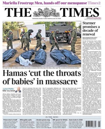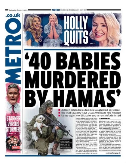 وعلى خطاها، سارت صحيفتا “مترو” و”التايمز” اللتان تحدثتا عن قيام حماس بإعدام 40 طفلا إسرائيليآ.