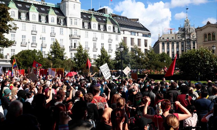 وتجمعت أيضا مجموعة مضادة من المتظاهرين، حيث قرعوا الطبول وغنوا ورددوا شعار “لا للعنصرية في شوارعنا” خلال مسيرة لمنظمة “أوقفوا أسلمة النرويج”(سيان).
