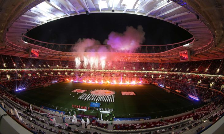 وجاء الافتتاح باستضافة الملعب للمباراة النهائية التي تجمع بين فريقي “السد” و”العربي” في بطولة “كأس الأمير”، بالتزامن مع احتفالات قطر بيومها الوطني.