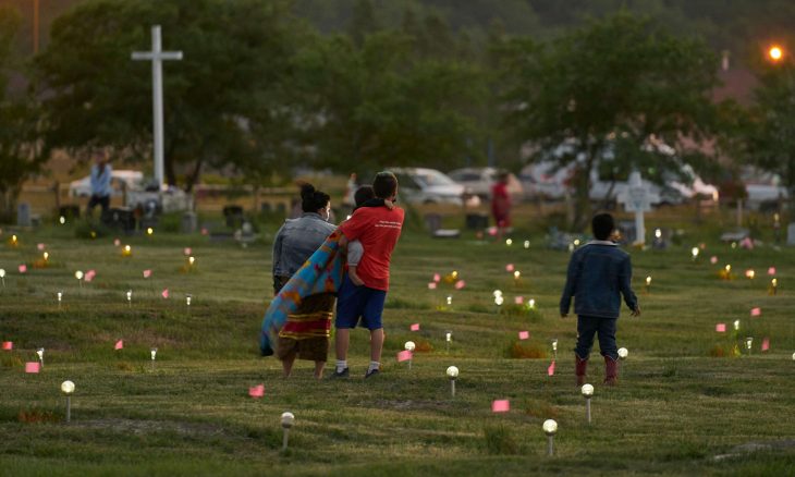 كنديون يقفون في أحد المواقع التي عثر فيها على مقبرة جماعية لأطفال مجهولين