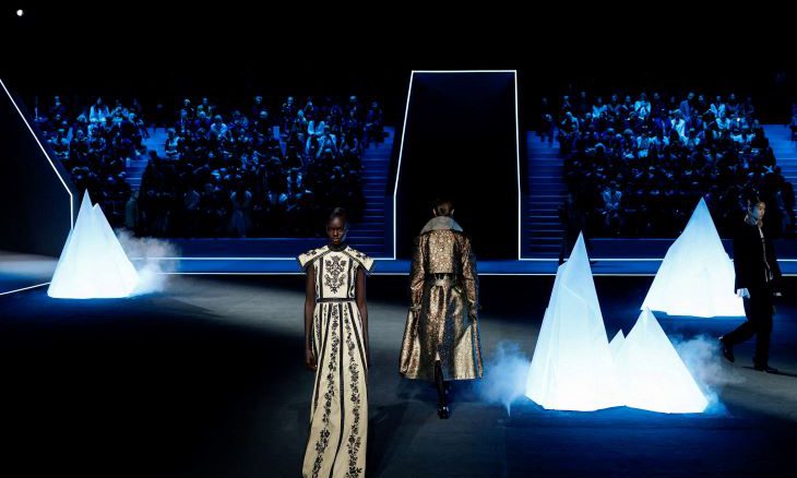 وضمّنت المصممة الإيطالية عرضها كعادتها مجموعة واسعة من الأساليب، إذ انقسم إلى لوحات عدة، بينها ما استلهمته من النار، من خلال ألسنة لهب أنشئت رقميا، وما استوحته من الهواء، مع نوع من طيور ما قبل التاريخ الميكانيكية التي حلّق في الصالة، ومن الجليد، مع الجبال الجليدية الصغيرة خارجة من أرضية العرض.