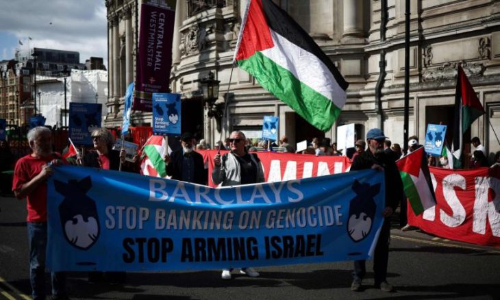 وقال المتظاهر خالد زلماي “إنه بنك شركات الأسلحة التي من الواضح أنها تزود إسرائيل بالأسلحة”.