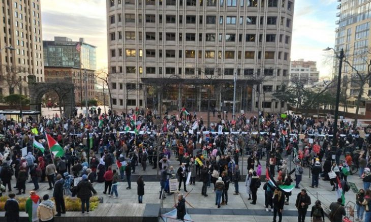 وبعد التجمع في منطقة ” ويستليك بارك”، استمع الجمهور إلى ناشط من السكان الأصليين كان يتحدث عن التضامن بين الحركات الأصلية وشعب فلسطين،  ثم استمرت المسيرة حتى مبنى “هنري إم. جاكسون ” الاتحادي، مع هتافات “لا دولار آخر، ولا سنت آخر، ولا مزيد من المال لجرائم إسرائيل” التي امتلأت الشوارع، إلى جانب “المقاومة مبررة عندما يكون الناس تحت الاحتلال”.