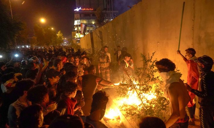 قبل وقت قصير من إطلاق النار الغزير، رفع المتظاهرون الأعلام العراقية فوق الكتل الإسمنتية المحيطة بالمبنى القنصلي الواسع، حيث يرفرف علم الجمهورية الإسلامية الإيرانية.