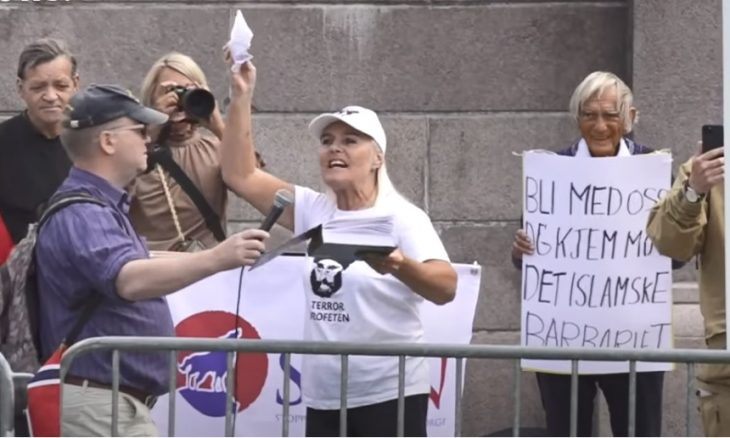 أقدمت مشاركة في تظاهرة مناهضة للإسلام، في العاصمة النرويجية أوسلو على تمزيق صفحات من القرآن الكريم.
