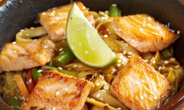 نخلط النودلز مع الهليون والأفوكادو ونضع السلمون على الوجه.