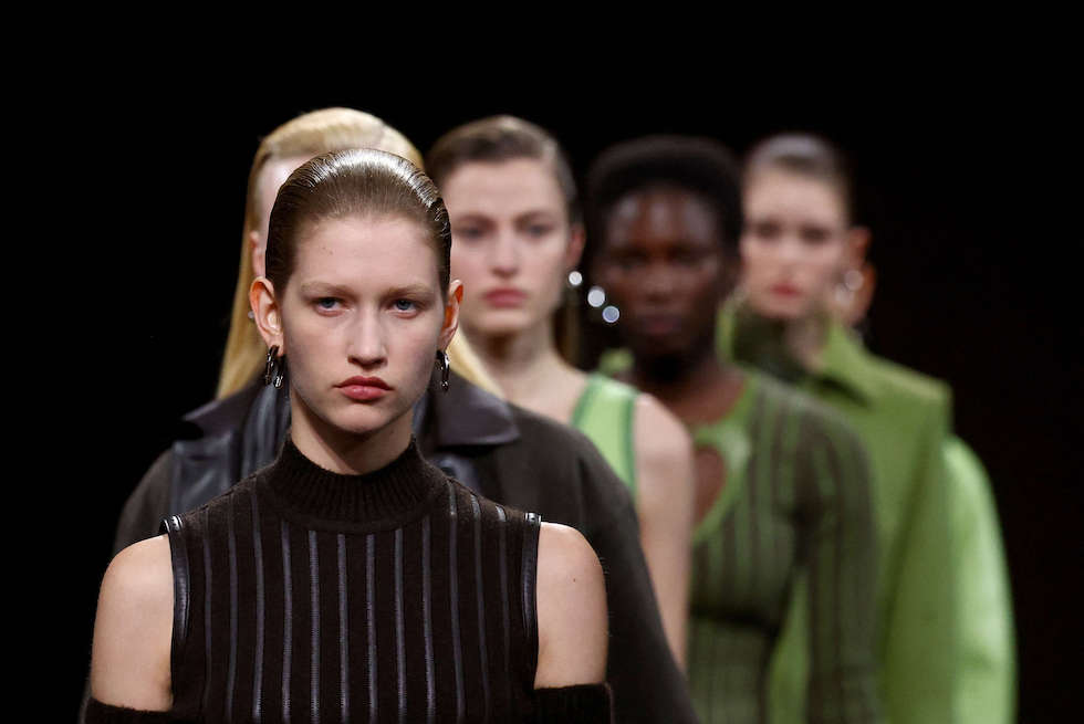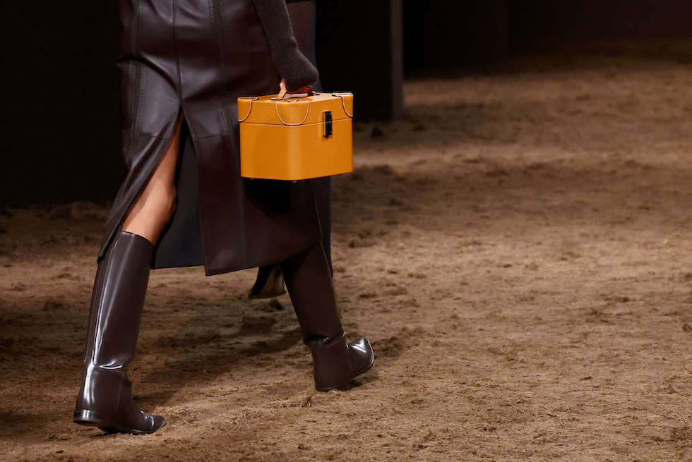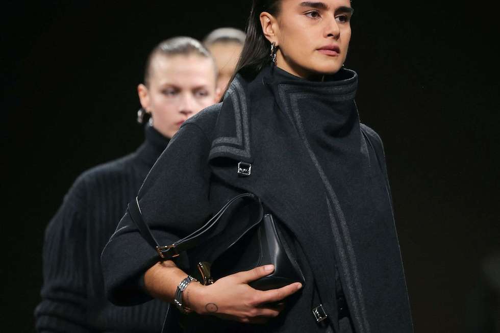 باريس: قدمت ناديج فاني مصممة الأزياء في دار هيرميس في باريس اليوم السبت مجموعة خريف وشتاء 2025 من المعاطف والفساتين والسراويل اللامعة المصنوعة من الجلد الداكن مستعرضة تصاميمها على منصة مغطاة بالصوف الخشن بني اللون.