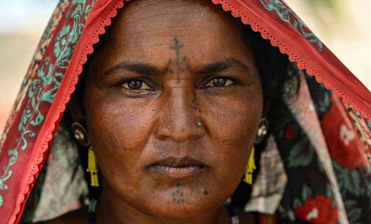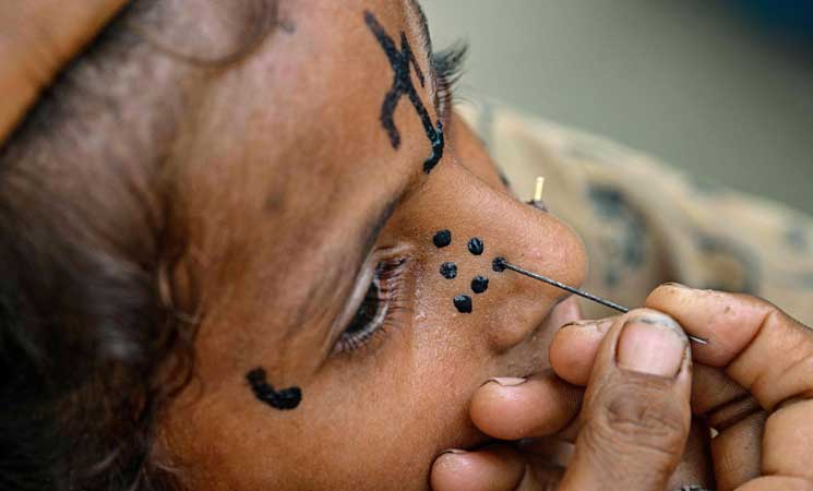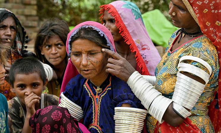 في القرى الهندوسية الواقعة على الحدود الشرقية لباكستان قرب الهند، ترسم نساء متخصصات في الوشم منذ قرون خطوطا من النقاط ودوائر وزخارف هندسية أخرى على وجوه الفتيات وأذرعهنّ وأياديهنّ.