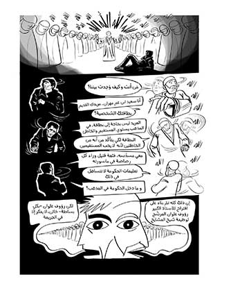 تناول الفنان الحسين فوزي (1905 ـ 1999) أعمال نجيب محفوظ من خلال نشرها في مجلة «الرسالة الجديدة» بداية من عام 1954، وهو أول فنان غرافيك مصري، وقدّم رواية «بين القصرين» مسلسلة على صفحات المجلة ـ تشارك معه في البداية كل من الفنانين حسن محمد حسن وسميحة حسنين ـ وكذلك رسوم رواية «أولاد حارتنا» في جريدة «الأهرام» عام 1959. ومن سمات الفنان وأسلوبه أنه «يتناول العادات والتقاليد الشعبية في المجتمع المصري، فصور الناس بواقعهم العادي البسيط.. ومحاولة ترجمة العناصر التشكيلية بلغة الوصف الأدبي». فالفنان هنا كان ملتزماً بالتفاصيل ودقتها، ما اقترب بها أكثر من المشهد السينمائي وأحجام اللقطة السينمائية .. كالاكتفاء بالنصف العلوي من الشخصيات في تجسيد مشهد حواري.
