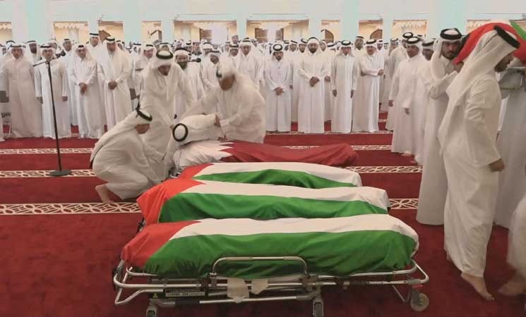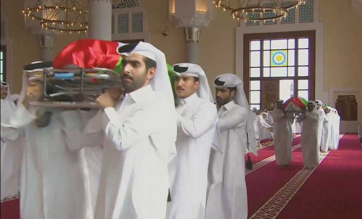 أدى أمير قطر الشيخ تميم بن حمد آل ثاني صلاة الجنازة على جثامين شهداء القصف الإسرائيلي على الدوحة، في مسجد الدولة. وشيع المسؤولون والمواطنون والمقيمون في قطر جثامين الضحايا في القصف الإسرائيلي الذي استهدف أحد المقرات التي كانت تؤوي مسؤولين في حماس.