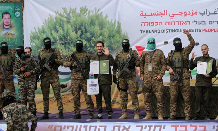 وخلال مراسم التسليم، قبّل أسير إسرائيلي رأس اثنين من عناصر “القسام” خلال وقوفه على المنصة بمخيم النصيرات.