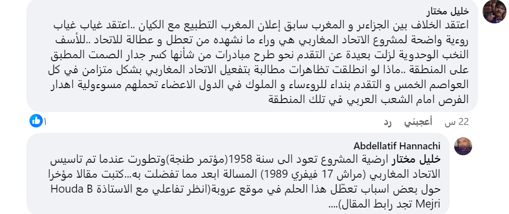 وتفاعل عدد من النشطاء مع ما كتبه الحناشي، حيث كتب خليل مختار “أعتقد الخلاف بين الجزائر والمغرب سبق إعلان المغرب التطبيع مع الكيان، كما أن غياب غياب رؤية واضحة لمشروع الاتحاد المغاربي هي وراء ما نشهده من تعطل وعطالة للاتحاد”.