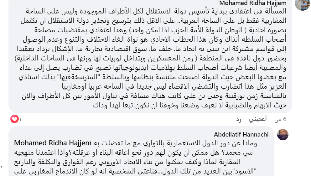 وعلق الحناشي بالقول: “وماذا عن دور الدول الاستعمارية بالتوازي مع ما تفضلت به؟ هل ممكن أن يكون لهم دور نحو إعاقة البناء أو عرقلته؟ وإذا اعتمدنا منهجية المقارنة، فلماذا وكيف تمكنوا من بناء الاتحاد الاوروبي رغم الفوارق والتكلفة والتاريخ “الأسود” بين العديد من تلك الدول؟”.