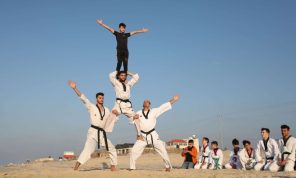 شبان وأطفال يمارسون رياضة التايكواندو على شاطئ بحر غزة- (صور)