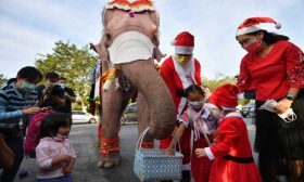 من على ظهر فيل.. بابا نويل يوزع الكمامات في تايلاند